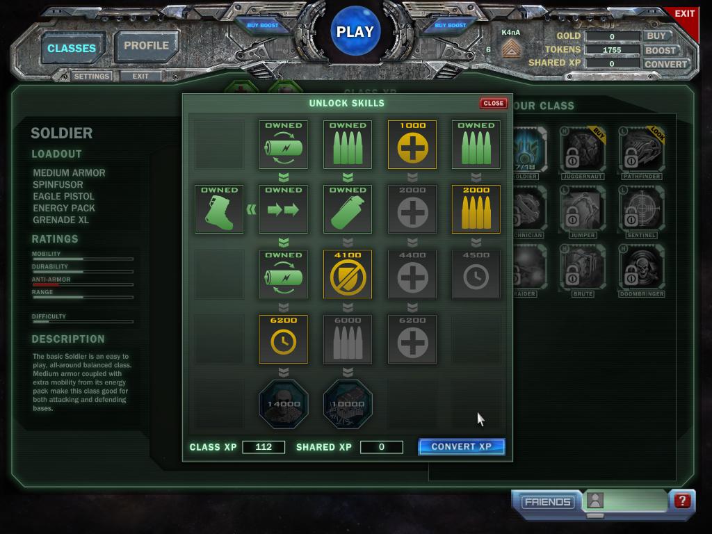 一戦プレイする度に各ClassのEXPと、共通のTokenを得られ、このTokenを消費することにより、新たなClassをUnlockする事が可能になっている。