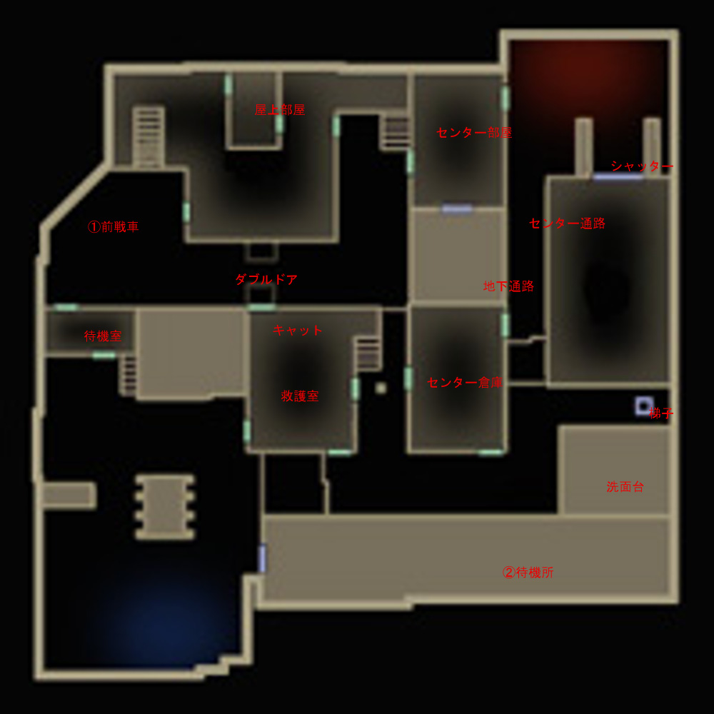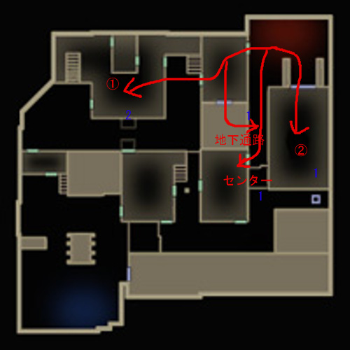もっとも地下は洗面台まで、そこから②待機所にHEを投げ込んで梯子からセンターを奇襲するのが面白い。