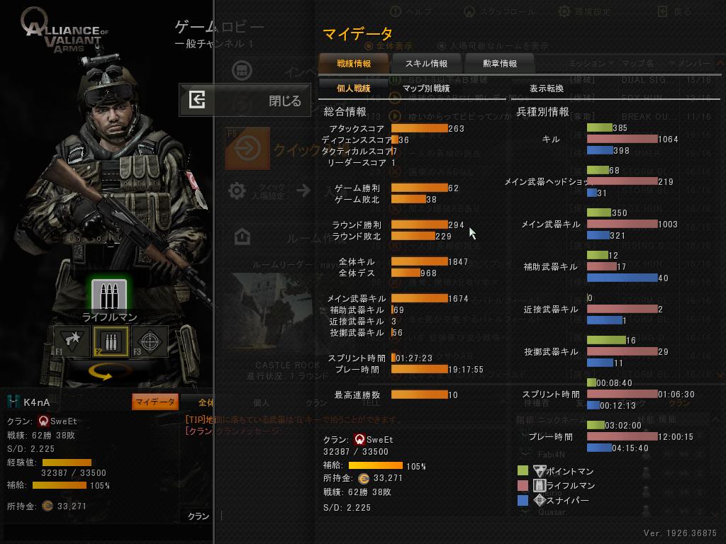 総kill1847の総death968なんで単純なK/Dだと2を少し割る程度ですね…。