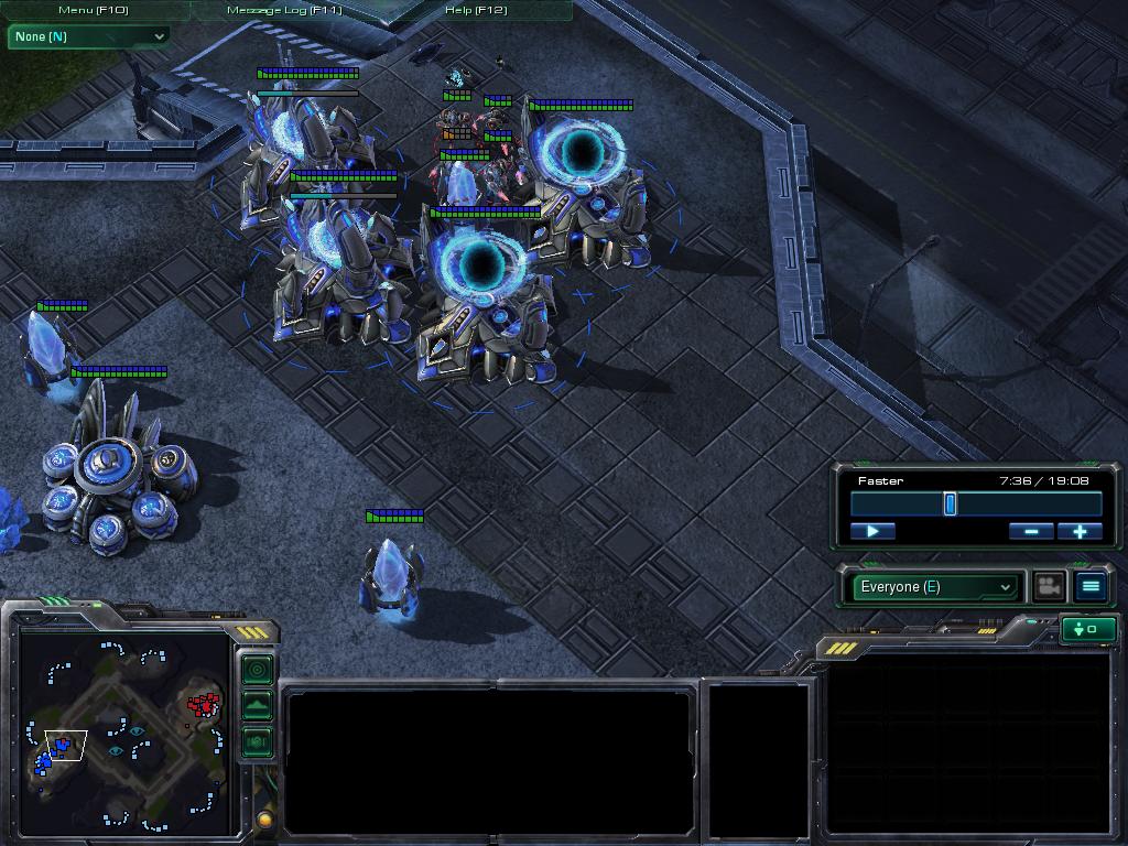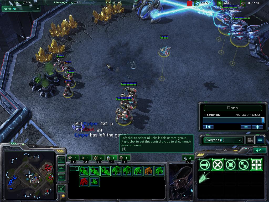 vs Zerg開始7分でZergling rushを喰らうも、この時点でこちらもそれなりにZealotが揃ってたので、なんとか返す。