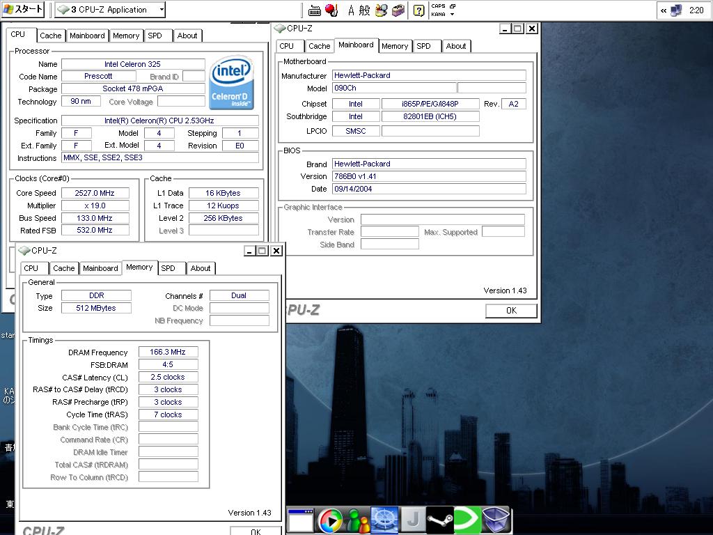 軽く自己紹介代わりに私のPCspec晒しでも・・・ SuddenAttack(以後SA)で共に戦ってるメンバーには一応PCspecについて話してはあったけど 実際にその証拠とも言えるような画像はなかったのでこんな所であげてみたり。 ご覧の通りですが一応 CPU:Celeron 2,53GHz Mem:256MB*2 M/B:865Gchipset VGA: 〃 カクカクでも健気に頑張ってます・・・。